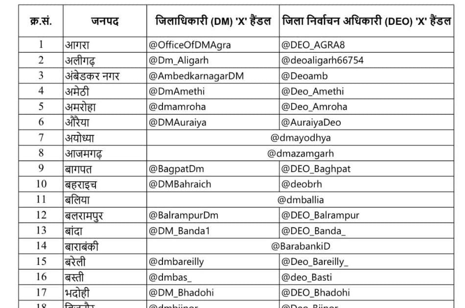 *उत्तर प्रदेश के समस्त ज़िलों के जिला निर्वाचन अधिकारियों के X हैंडल नीचे दिए गए हैं।* * जिन नागरिकों ...