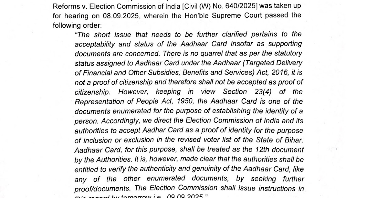 🗳️ मतदाता सूची पुनरीक्षण (SIR) में आधार को पहचान प्रमाण के रूप में स्वीकार करने संबंधी निर्वाचन आयोग का ...