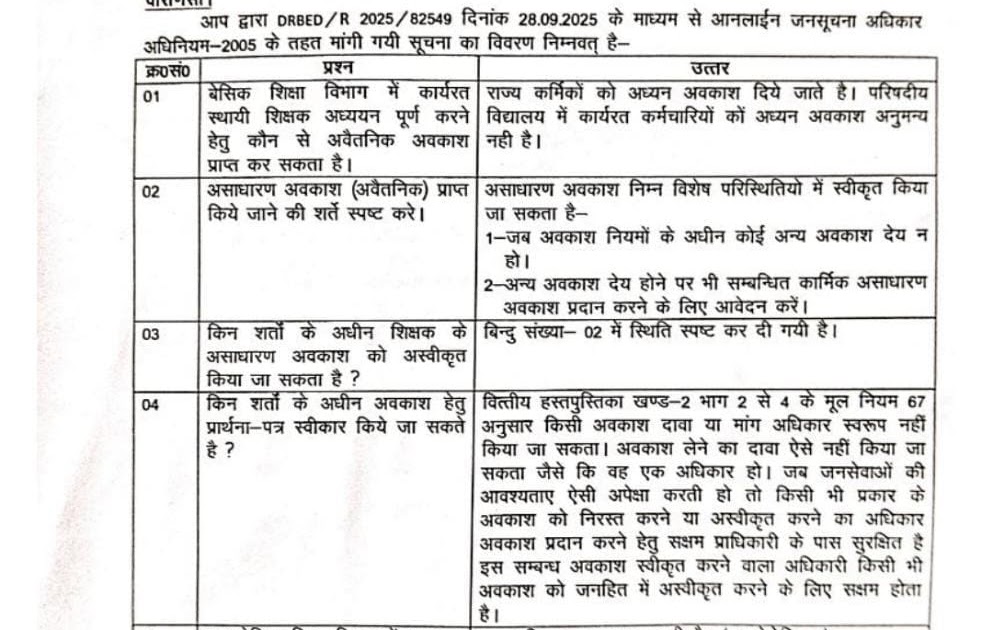 धीरज चंदानी(सहायक अध्यापक)के द्वारा असाधारण अवकाश की जानकारी हेतु मांगे गए RTI का जवाब – UpdateMarts| PRIMARY KA MASTER | SHIKSHAMITRA | Basic Shiksha News
