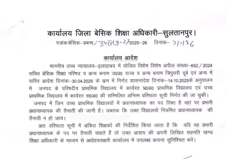 उच्च प्राथमिक विद्यालयों में प्रभारी प्रधानाध्यापक की तैनाती हेतु सहमति अनिवार्य, वरिष्ठता सूची के आधार पर जारी हुआ आदेश ...