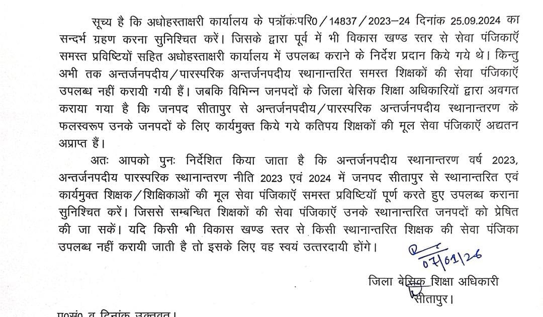 *जनपद सीतापुर से* स्थानान्तरित एवं कार्यमुक्त शिक्षक/शिक्षिकाओं की मूल सेवा पंजिकाएँ समस्त प्रविष्टियों पूर्ण करते हुए उनके स्थानांतरित जनपदों को प्रेषित किए जाने के सम्बन्ध में। – UpdateMarts| PRIMARY KA MASTER | SHIKSHAMITRA | Basic Shiksha News