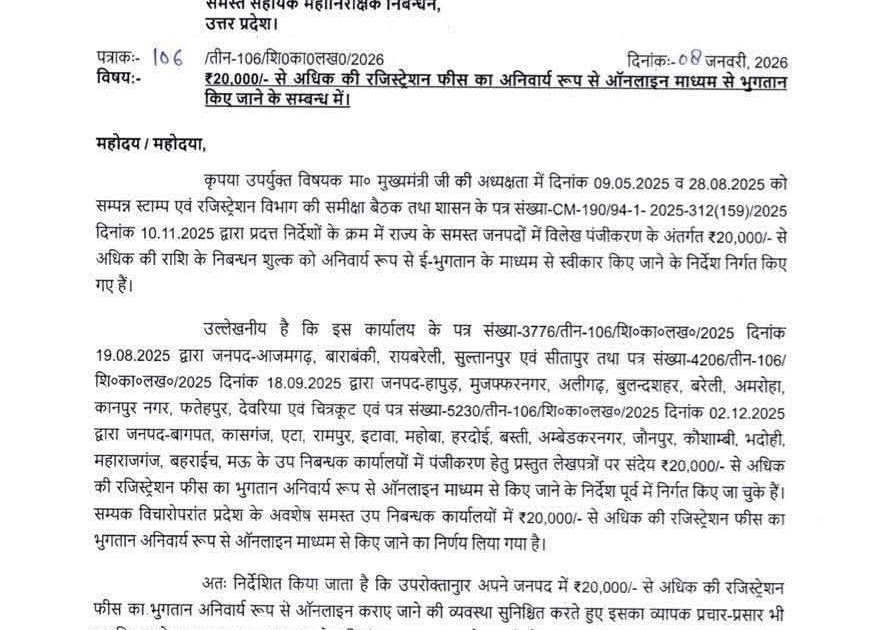 *बड़ी खबर |* *रजिस्ट्री से जुड़ा महत्वपूर्ण अपडेट अब उत्तर प्रदेश में ₹20,000/- से अधिक की रजिस्ट्रेशन फीस* *👉 ...