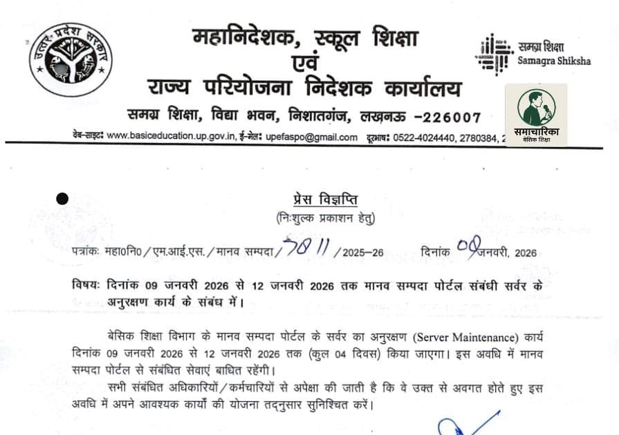 दिनांक 09 जनवरी 2026 से 12 जनवरी 2026 तक मानव सम्पदा पोर्टल संबंधी सर्वर के अनुरक्षण* कार्य के संबंध में।✍️ – UpdateMarts| PRIMARY KA MASTER | SHIKSHAMITRA | Basic Shiksha News