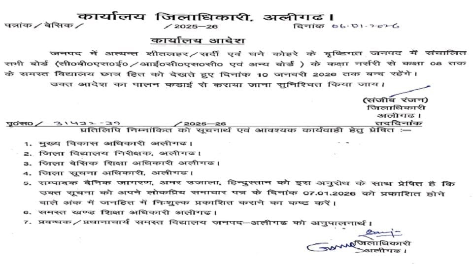 अलीगढ़ के डीएम संजीव रंजन ने 10 जनवरी तक नर्सरी से कक्षा आठ तक के सभी बोर्ड के सभी ...
