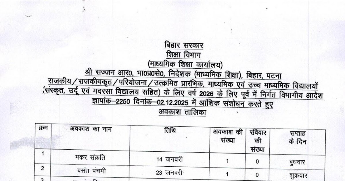 बिहार के सरकारी विद्यालयों के लिए संशोधित अवकाश तालिका जारी – UpdateMarts| PRIMARY KA MASTER | SHIKSHAMITRA | Basic Shiksha News