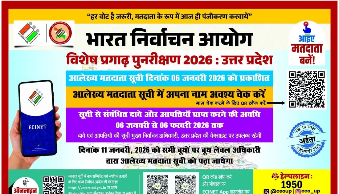 लखनऊ। भारत निर्वाचन आयोग द्वारा विशेष गहन पुनरीक्षण कार्यक्रम–2026 के तहत उत्तर प्रदेश की आलेख्य मतदाता सूची 06 जनवरी ...