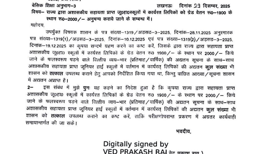 ➡️ राज्य द्वारा अशासकीय सहायता प्राप्त जू०हा० स्कूलों में कार्यरत लिपिकों को ग्रेड वेतन 1900 के स्थान ग्रेड पे 2000 किया गया। 👍❤️ – UpdateMarts| PRIMARY KA MASTER | SHIKSHAMITRA | Basic Shiksha News