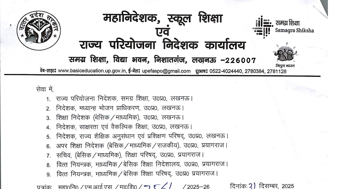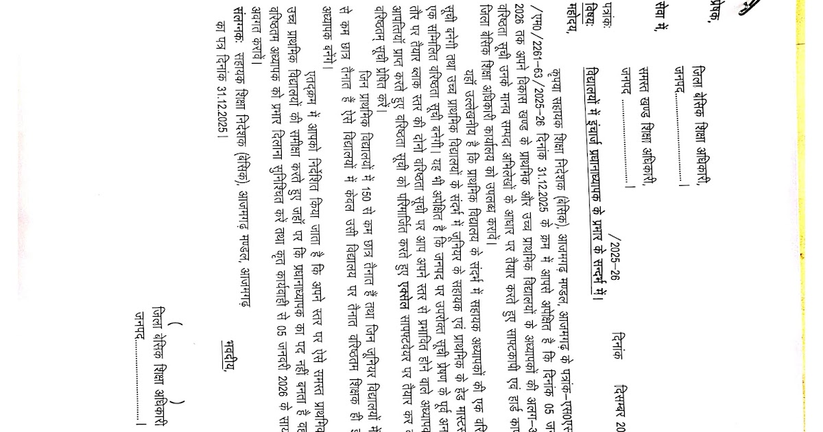 विद्यालयों में इंचार्ज प्रधानाध्यापक के प्रभार के सन्दर्भ में। महोदय, आप अवगत हैं कि आज दिनांक 31.12.2025 को ए०सी०एस० ...