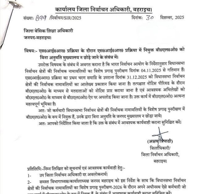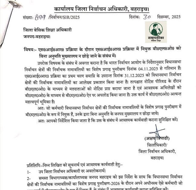 एस०आई०आर० प्रक्रिया के दौरान एस0आई0आर0 प्रक्रिया में नियुक्त *बी०एल०ओ० को बिना अनुमति मुख्यालय न छोड़े जाने* के संबंध में। – UpdateMarts| PRIMARY KA MASTER | SHIKSHAMITRA | Basic Shiksha News