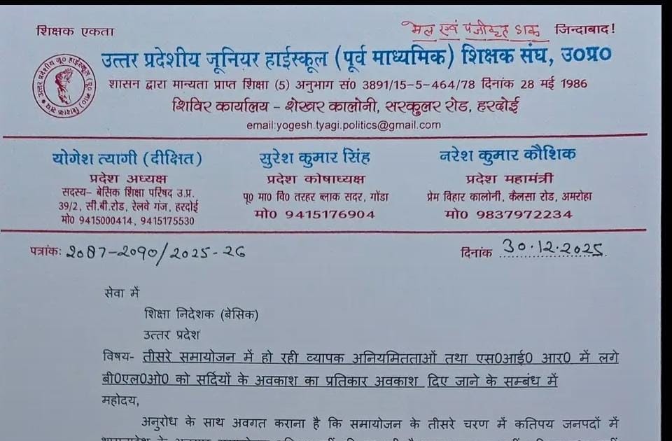 *समायोजन/ स्थानांतरण 3.0 में अनियमितता तथा SIR कार्य करने वालों शिक्षक, शिक्षा मित्र /अनुदेशक को प्रतिकर अवकाश के संबंध में शिक्षा निदेशक बेसिक को मांग पत्र*☝️ – UpdateMarts| PRIMARY KA MASTER | SHIKSHAMITRA | Basic Shiksha News