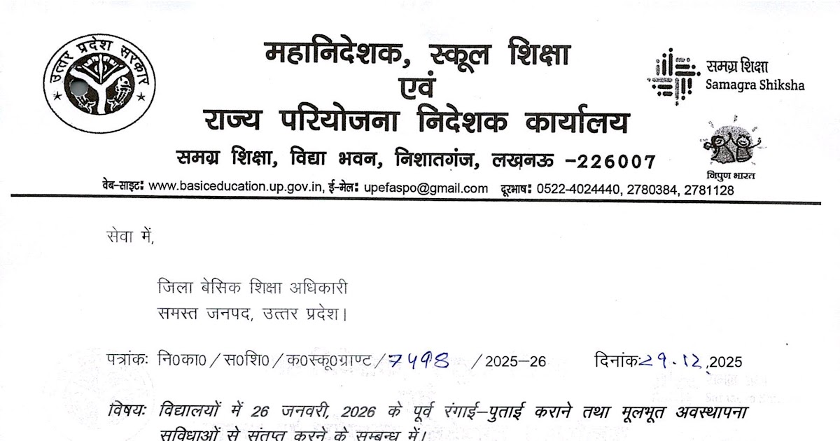 विद्यालयों में 26 जनवरी, 2026 के पूर्व रंगाई-पुताई कराने तथा मूलभूत अवस्थापना सुविधाओं से संतृप्त करने के सम्बन्ध में। – UpdateMarts| PRIMARY KA MASTER | SHIKSHAMITRA | Basic Shiksha News