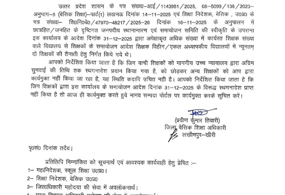 समायोजन में कोर्ट से स्टे प्राप्त शिक्षकों को छोड़कर शेष सभी को नवीन विद्यालय में कार्यभार ग्रहण करने के लिए बीएसए सर लखीमपुर का आदेश! – UpdateMarts| PRIMARY KA MASTER | SHIKSHAMITRA | Basic Shiksha News