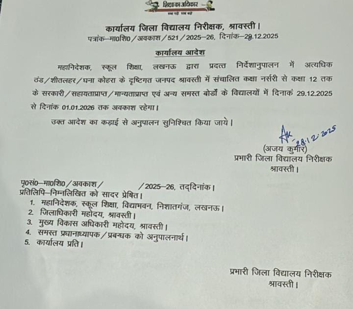 कार्यालय आदेश महानिदेशक, स्कूल शिक्षा, लखनऊ द्वारा प्रदत्त निर्देशानुपालन में अत्यधिक ठंड/शीतलहर/घना कोहरा के दृष्टिगत जनपद श्रावस्ती में संचालित ...