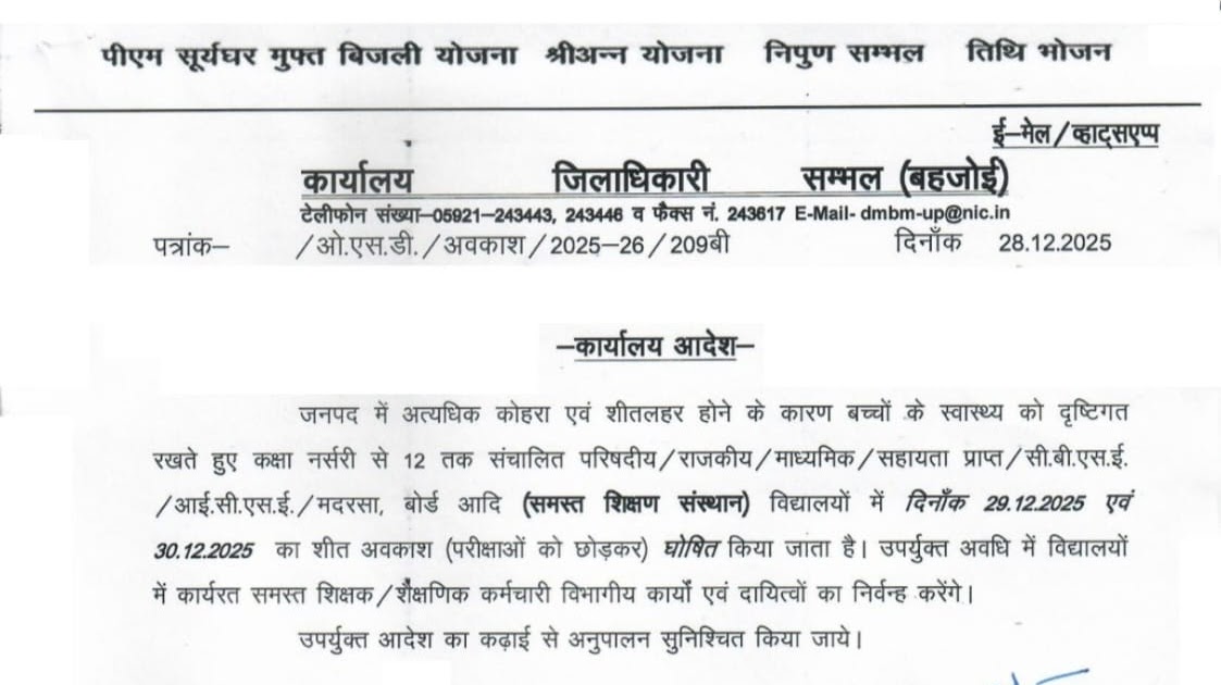सम्भल : 12वीं तक के स्कूल 29 / 30 दिसंबर तक बंद – UpdateMarts| PRIMARY KA MASTER | SHIKSHAMITRA | Basic Shiksha News