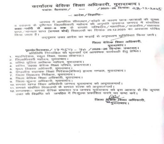 मुरादाबाद में ठंड और कोहरे के कारण स्कूल बंद जिले में ज्यादा ठंड और घना कोहरा होने की वजह से ...