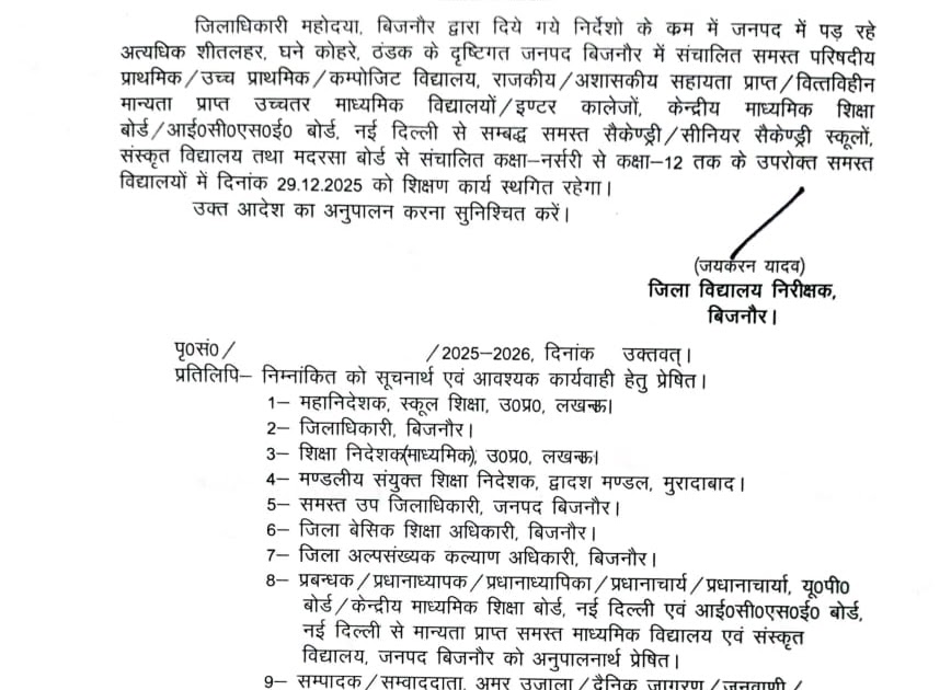 शीत लहर केचलते जनपद के कक्षा 1 से 8 तक के स्कूल में 2 दिन का अवकाश घोषित डीएम ज्ञानेन्द्र सिंह ने 29 और 30 दिसंबर को स्कूल में अवकाश किया घोषित – UpdateMarts| PRIMARY KA MASTER | SHIKSHAMITRA | Basic Shiksha News