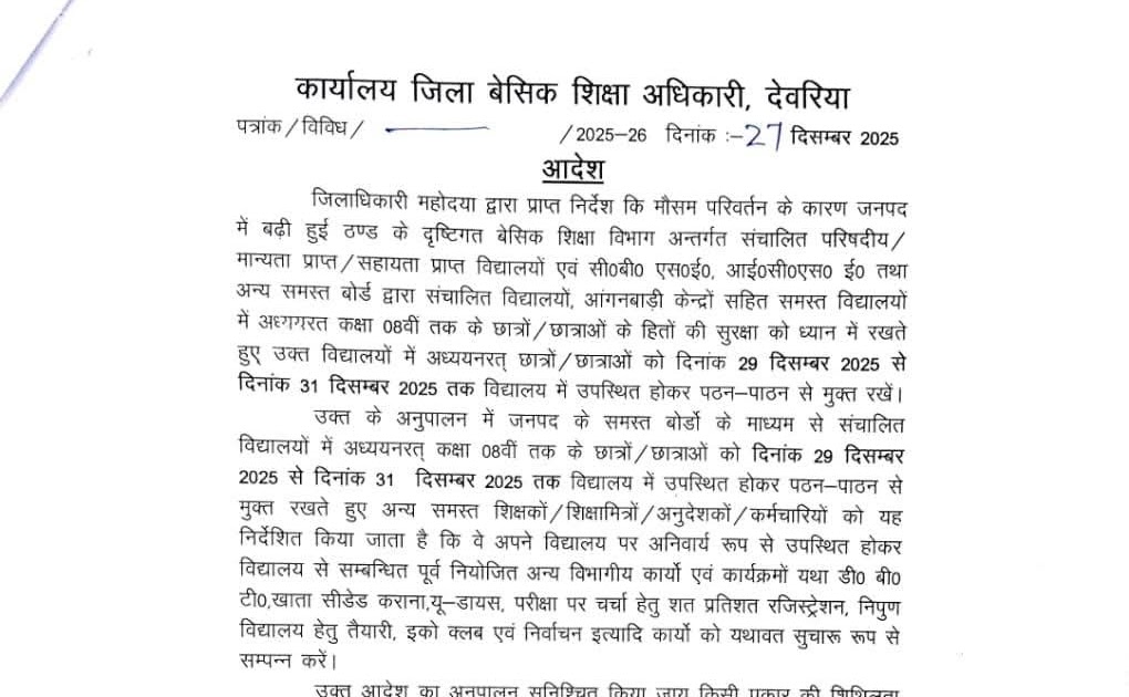 बढ़ती ठंड को देखते हुए देवरिया के 1 से 8 तक के विद्यालय बंद का आदेश:31 तक कल लिए – UpdateMarts| PRIMARY KA MASTER | SHIKSHAMITRA | Basic Shiksha News