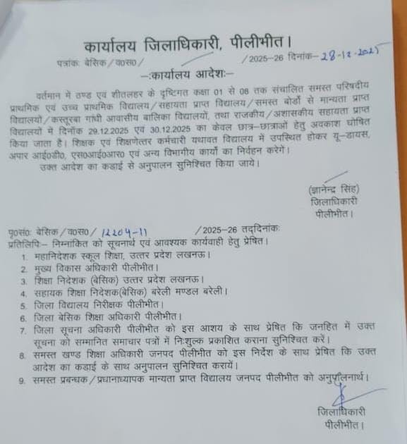 पीलीभीत : शीत लहर केचलते जनपद के कक्षा 1 से 8 तक के स्कूल में 2 दिन का अवकाश ...