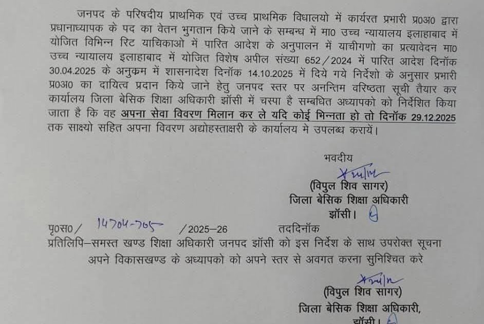 झांसी में प्रभारी प्रधानाध्यापकों के वेतन भुगतान को लेकर कार्रवाई तेज, सेवा विवरण सत्यापन के निर्देश जारी झांसी। जनपद के ...