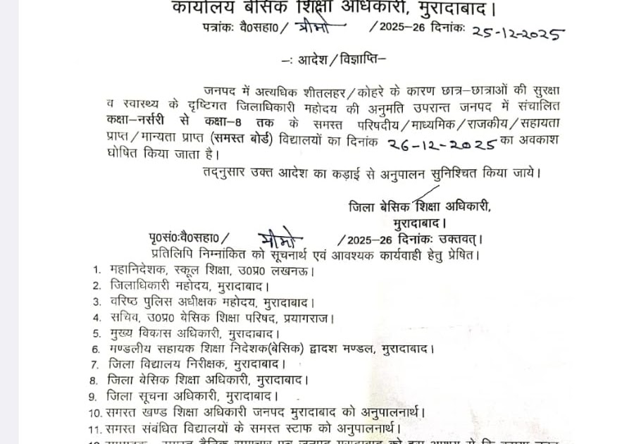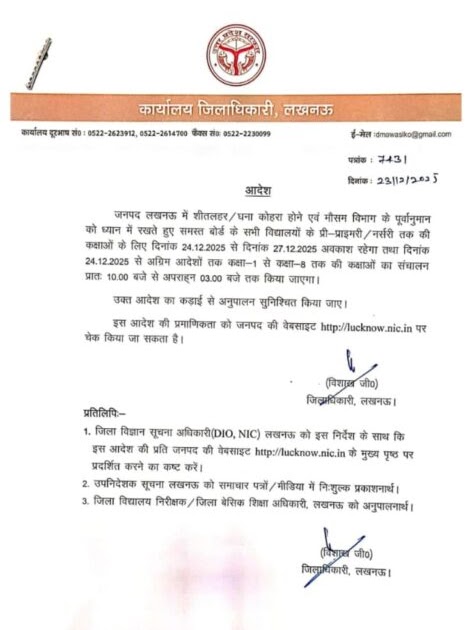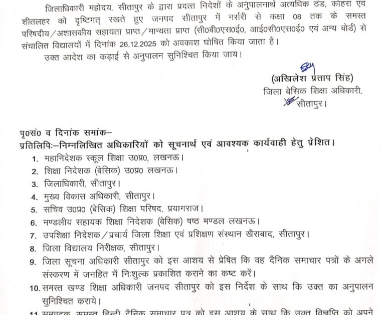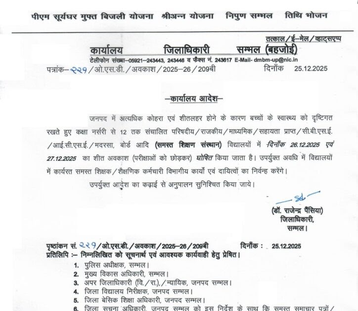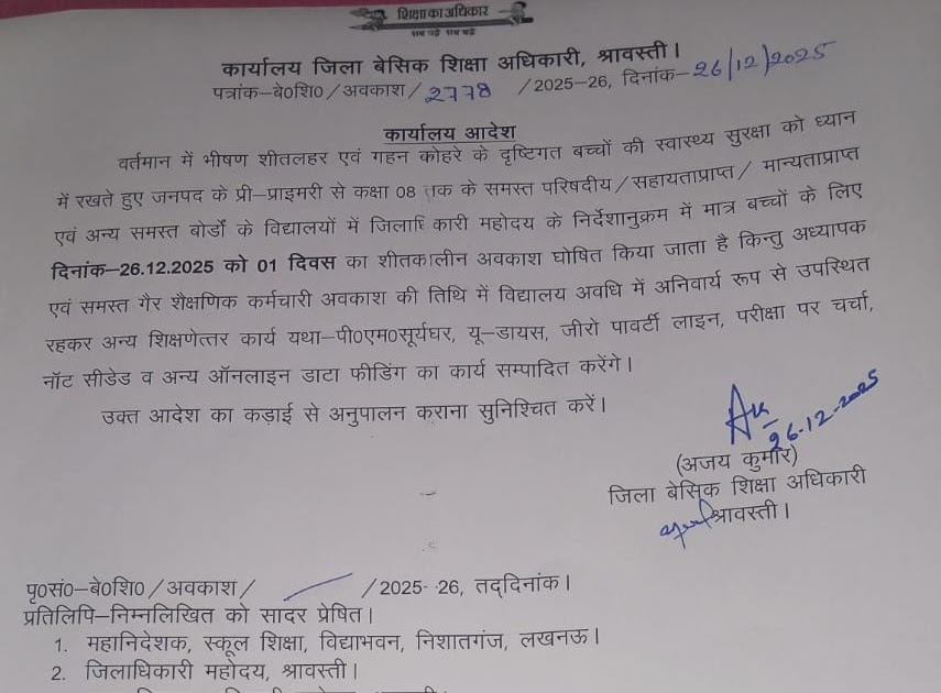 दिनांक 27 दिसंबर 2025 तक विद्यालय में पठन-पाठन स्थगित किए जाने के संबंध में – UpdateMarts| PRIMARY KA MASTER | SHIKSHAMITRA | Basic Shiksha News