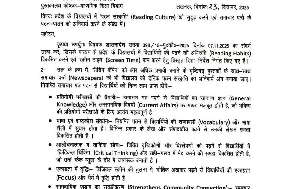आर्डर कॉपी: प्रदेश के विद्यालयों में ‘पठन संस्कृति’ (Reading Culture) को सुदृढ़ करने एवं समाचार पत्रों के पठन-पाठन को अनिवार्य करने के संबंध में। – UpdateMarts| PRIMARY KA MASTER | SHIKSHAMITRA | Basic Shiksha News