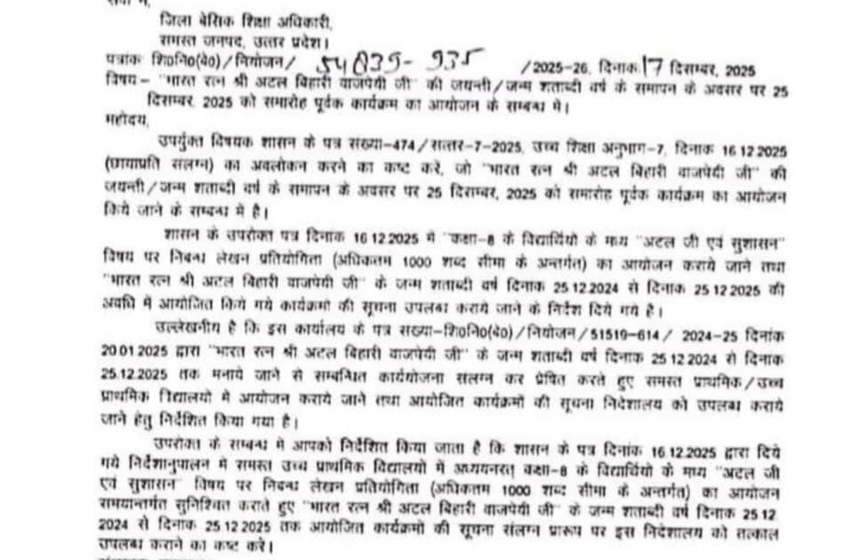भारत रत्न श्री अटल बिहारी वाजपेयी जी की जयन्ती/जन्म शताब्दी वर्ष के समापन के अवसर पर 25 दिसम्बर 2025 को समारोह पूर्वक कार्यक्रम का आयोजन के सम्बन्ध में। – UpdateMarts| PRIMARY KA MASTER | SHIKSHAMITRA | Basic Shiksha News