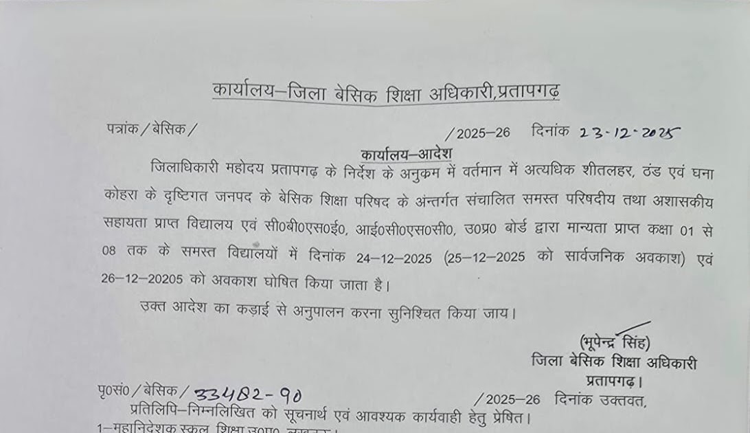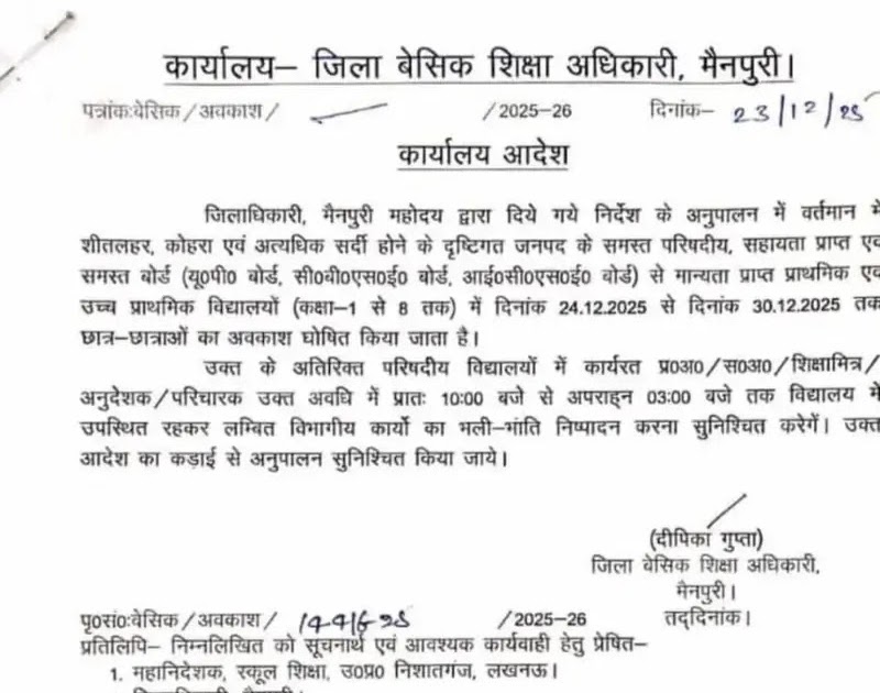 भीषण ठंड के चलते उत्तर प्रदेश के इस जिले में 30 दिसम्बर तक का अवकाश हुआ घोषित, आदेश जारी – UpdateMarts| PRIMARY KA MASTER | SHIKSHAMITRA | Basic Shiksha News