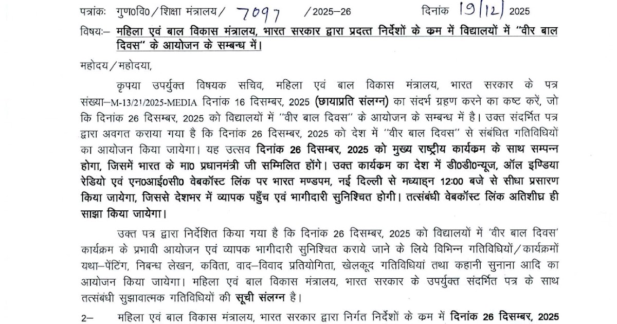 दिनांक 26 दिसंबर ,2025* को समस्त विद्यालयों में *वीर बाल दिवस* कार्यक्रम का आयोजन किये जाने के संबंध में – UpdateMarts| PRIMARY KA MASTER | SHIKSHAMITRA | Basic Shiksha News