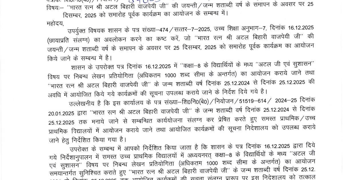 “भारत रत्न श्री अटल बिहारी वाजपेयी जी की जयन्ती / जन्म शताब्दी वर्ष के समापन के अवसर पर 25 दिसम्बर, 2025 को समारोह पूर्वक कार्यक्रम का आयोजन के सम्बन्ध में। – UpdateMarts| PRIMARY KA MASTER | SHIKSHAMITRA | Basic Shiksha News