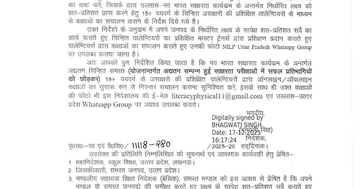 नव भारत साक्षरता कार्यक्रम के अन्तर्गत 15+ वयवर्ग के असाक्षरों की कक्षाओं का संचालन के संबंध में। Basic Shiksha ...