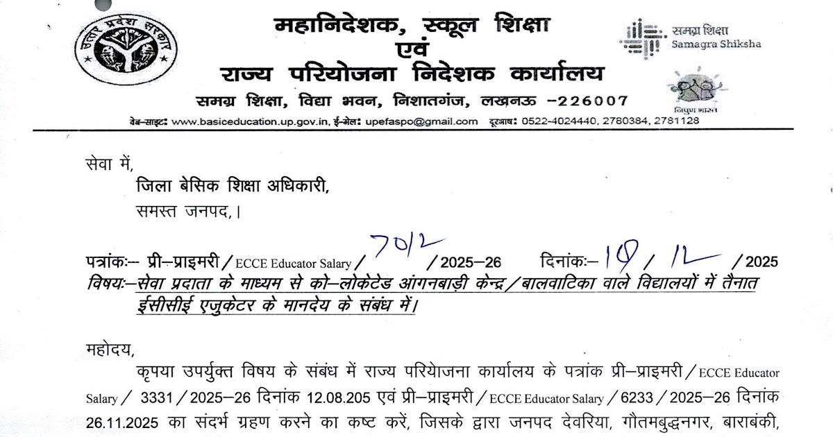 सेवा प्रदाता के माध्यम से को-लोकेटेड आंगनबाड़ी केन्द्र/बालवाटिका वाले विद्यालयों में तैनात ईसीसीई एजुकेटर के मानदेय केसम्बन्ध में। – UpdateMarts| PRIMARY KA MASTER | SHIKSHAMITRA | Basic Shiksha News