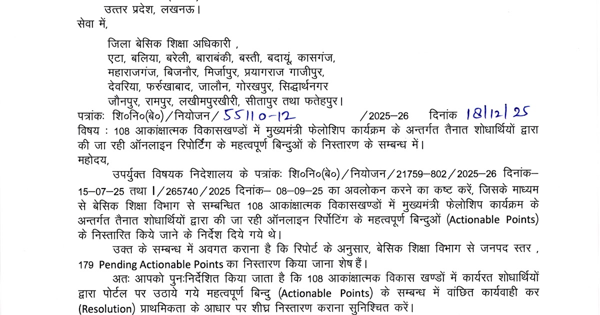 108 आकांक्षात्मक विकासखण्डों में मुख्यमंत्री फेलोशिप कार्यक्रम के अन्तर्गत तैनात शोधार्थियों द्वारा की जा रही ऑनलाइन रिपोर्टिंग के महत्वपूर्ण बिन्दुओं के निस्तारण के सम्बन्ध में। – UpdateMarts| PRIMARY KA MASTER | SHIKSHAMITRA | Basic Shiksha News