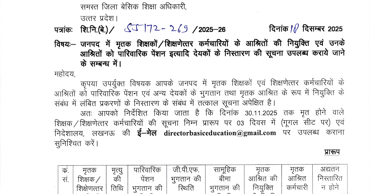 जनपद में मृतक शिक्षकों/ शिक्षणेत्तर कर्मचारियों के आश्रितों की नियुक्ति एवं उनके आश्रितों को पारिवारिक पेंशन इत्यादि देयकों के निस्तारण की सूचना उपलब्ध कराये जाने के सम्बन्ध में। – UpdateMarts| PRIMARY KA MASTER | SHIKSHAMITRA | Basic Shiksha News