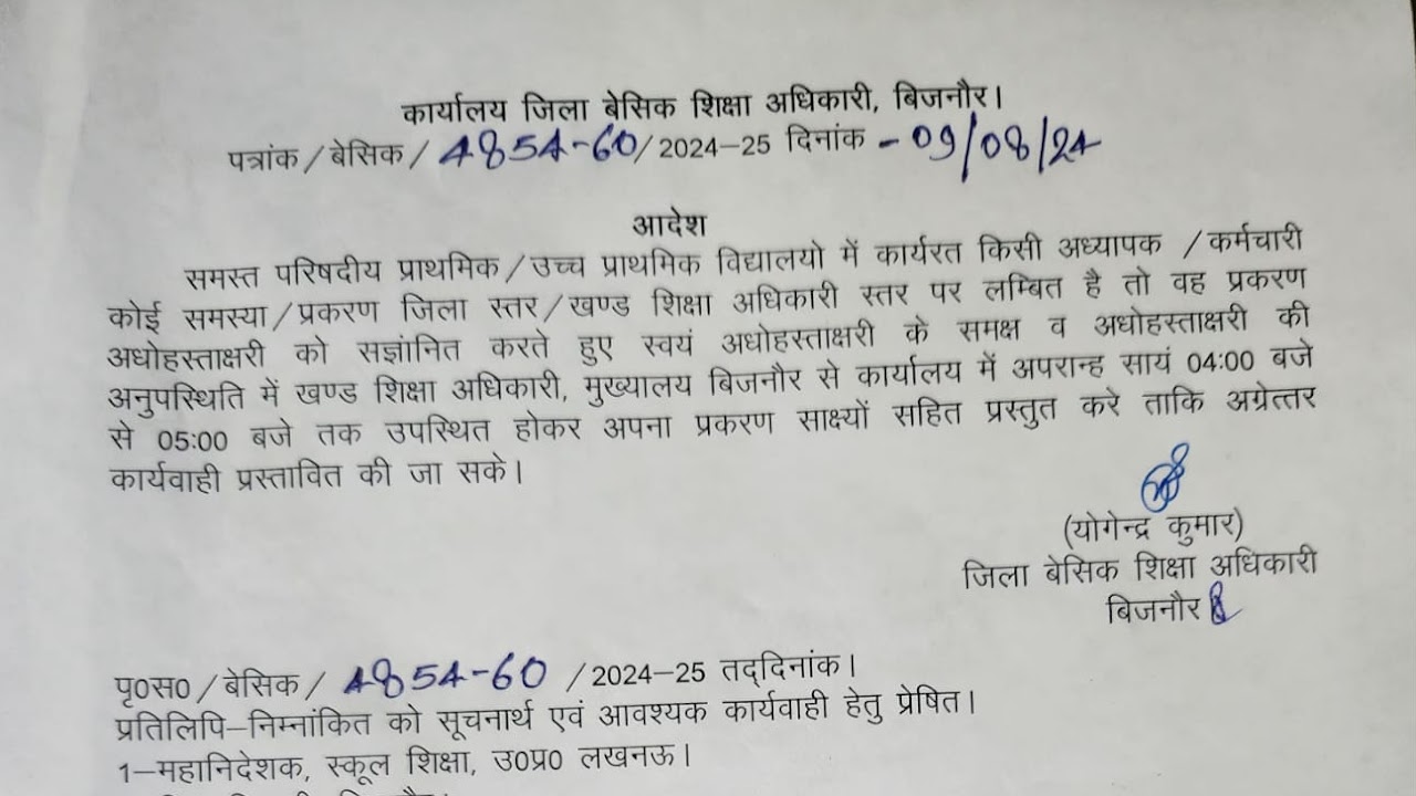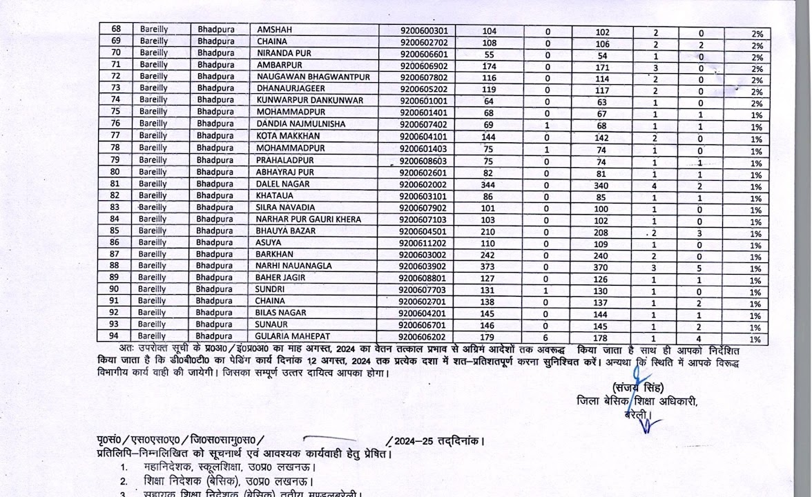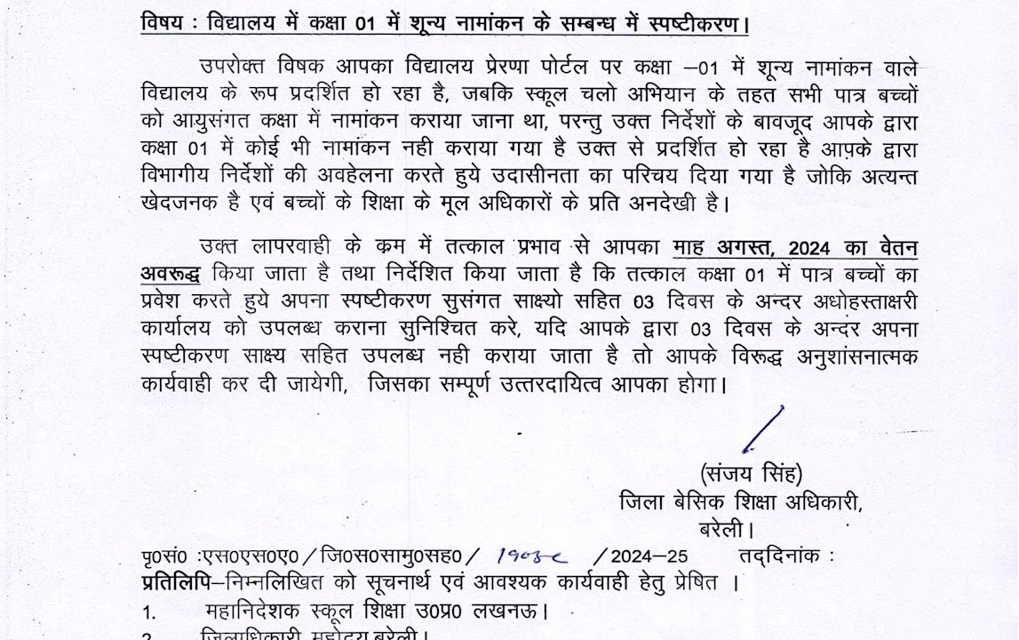 प्र०अ०/इ 0प्र०अ० का DBT कार्य में लापरवाही के चलते माह अगस्त, 2024 का वेतन तत्काल प्रभाव से अग्रिम आदेशों तक अवरूद्ध