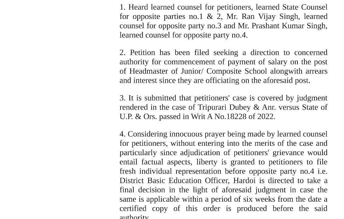 छ: सप्ताह में एरियर व ब्याज सहित हरदोई के 84 इंचार्ज शिक्षकों को भी हेड का वेतन देने हेतु माननीय ...