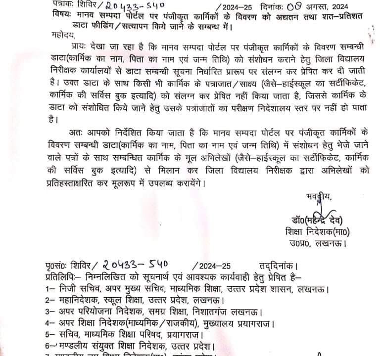मानव सम्पदा पोर्टल पर पंजीकृत कार्मिकों के विवरण को अद्यतन तथा शत-प्रतिशत डाटा फीडिंग/सत्यापन किये जाने के सम्बन्ध में।