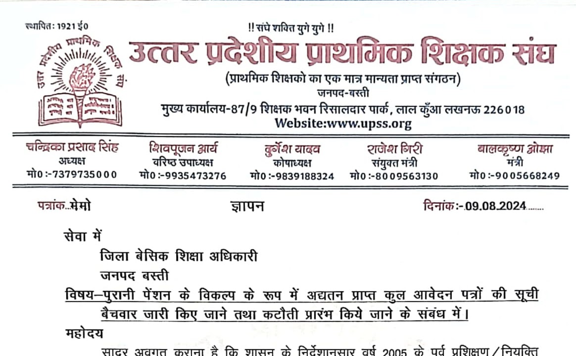 ज्ञापन -पुरानी पेंशन के विकल्प के रूप में अद्यतन प्राप्त कुल आवेदन पत्रों की सूची बैचवार जारी किए जाने तथा कटौती प्रारंभ किये जाने के संबंध में।