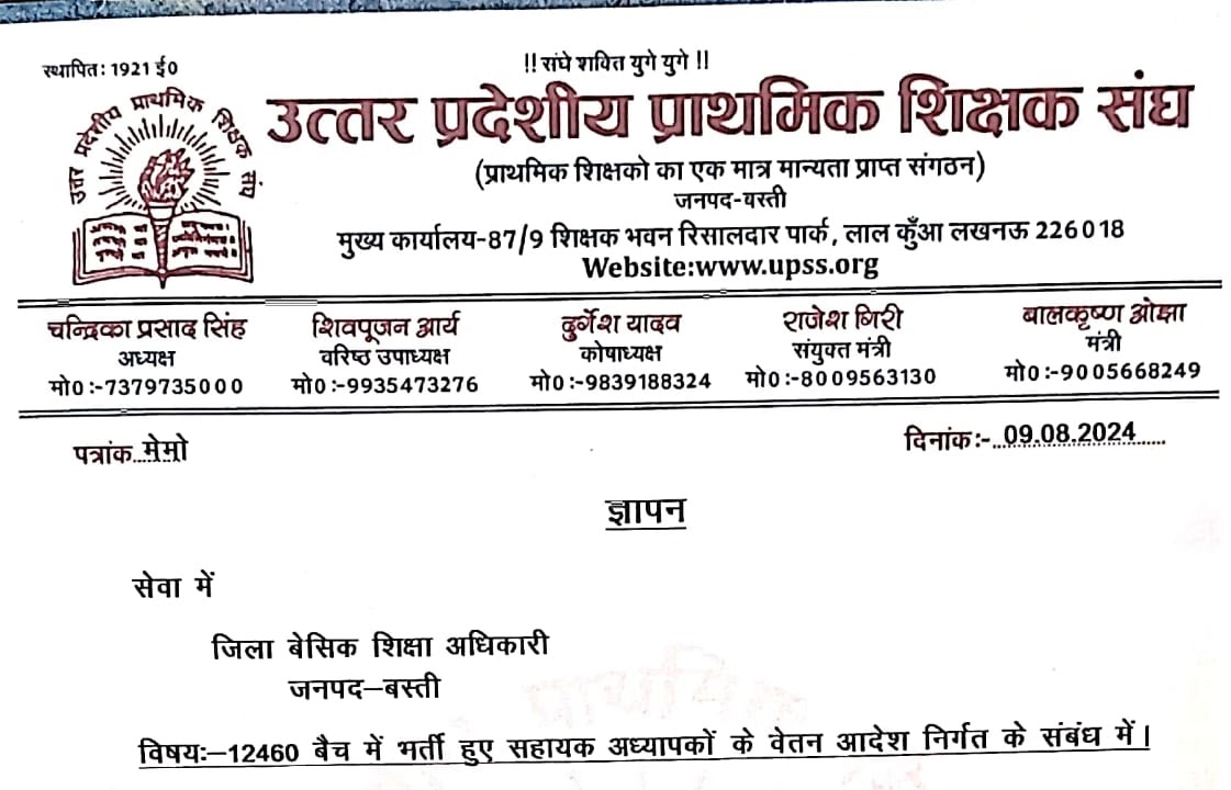ज्ञापन -12460 बैच में भर्ती हुए सहायक अध्यापकों के वेतन आदेश निर्गत के संबंध में।