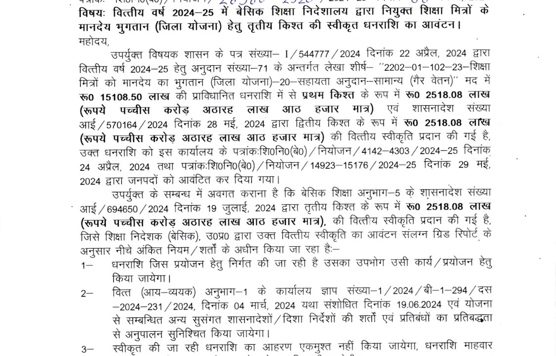 वित्तीय वर्ष 2024-25 में बेसिक शिक्षा निदेशालय द्वारा नियुक्त शिक्षा मित्रों के मानदेय भुगतान (जिला योजना) हेतु तृतीय किश्त की स्वीकृत धनराशि का आवंटन