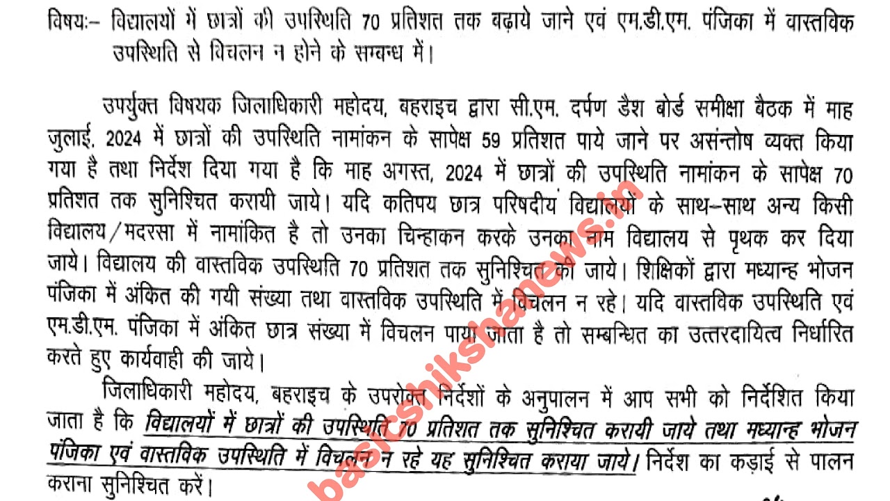 विद्यालयों में छात्रों की उपस्थिति 70 प्रतिशत तक बढ़ाये जाने एवं एम.डी.एम. पंजिका में वास्तविक उपस्थिति से विचलन न होने के सम्बन्ध में।