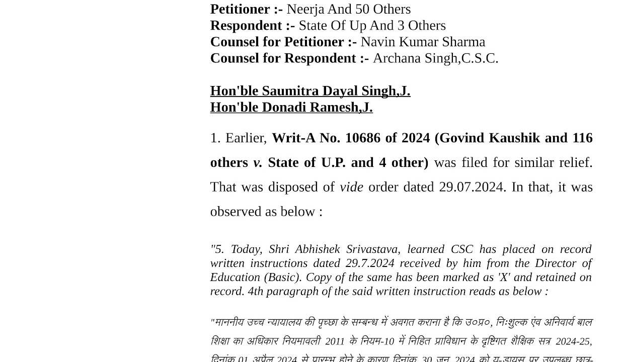 पुष्कर सिंह चंदेल व अन्य (Writ-A 5232/2024) से सम्बद्ध लभग दर्जनभर याचिकाएं जो उत्तर प्रदेश बेसिक शिक्षा परिषद के प्राथमिक ...