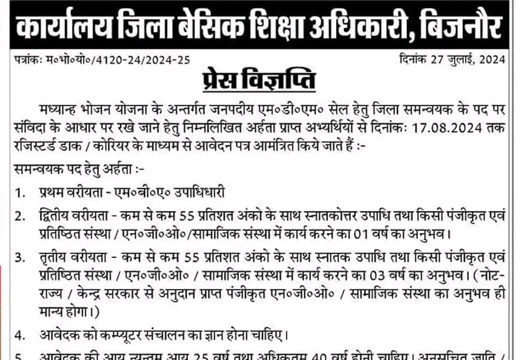 मध्यान्ह भोजन योजना के अन्तर्गत जनपदीय एम०डी०एम० सेल हेतु जिला समन्वयक के पद पर संविदा के आधार पर रखे जाने हेतु विज्ञप्ति जारी