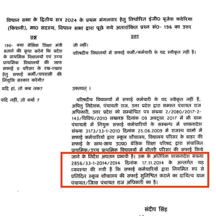 प्राथमिक विद्यालयों एवं उच्च प्राथमिक विद्यालयों की साफ सफाई व परिसर के रख-रखाव हेतु सफाई कर्मी/चपरासी की नियुक्ति के सम्बन्ध में बेसिक शिक्षा मंत्री का जवाब