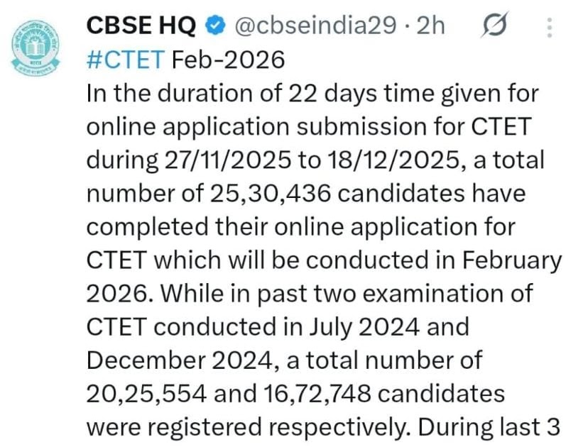 CTET 2025 में कुल आवेदन की संख्या : 25,30,436 हैं,पिछले साल की तुलना में इस साल 5 लाख आवेदन अधिक ...