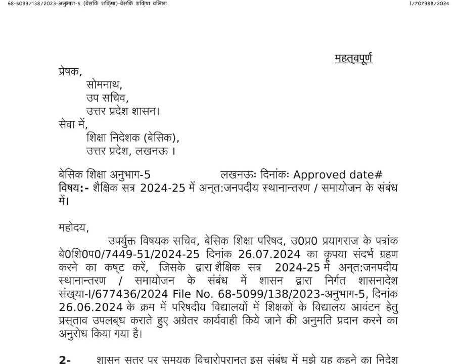 प्राथमिक फिर उच्च प्राथमिक के शिक्षकों का समायोजन प्रयागराज, परिषदीय विद्यालयों के अंत जनपदीय स्थानांतरण/समायोजन के क्रम में प्रथम चरण ...