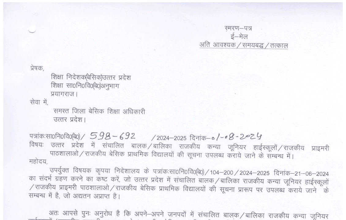 उ0प्र0 में संचालित बालक/बालिका रा0क0जू0हा0/राज0 प्रा0 पाठशालाओं/राज0 बे0प्राथमिक वि0 की सूचना उपलब्ध कराये जाने विषयक