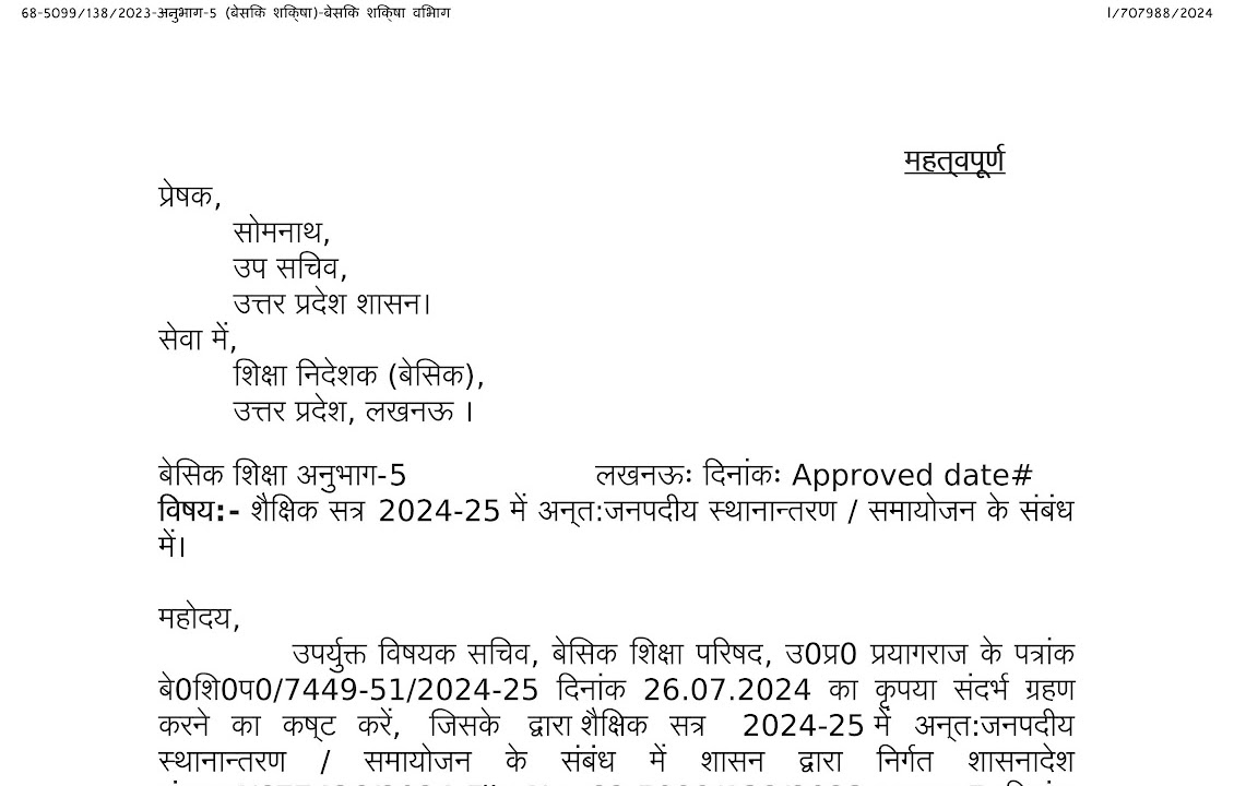 शैक्षिक सत्र 2024-25 में अन्त:जनपदीय स्थानान्तरण / समायोजन के संबंध में नवीन आदेश व निर्देश जारी