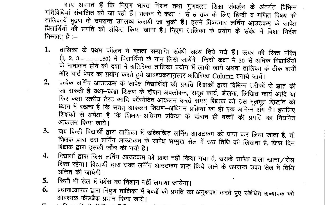 निपुण तालिका के प्रयोग एवं वितरण के सम्बन्ध में दिशा निर्देश।