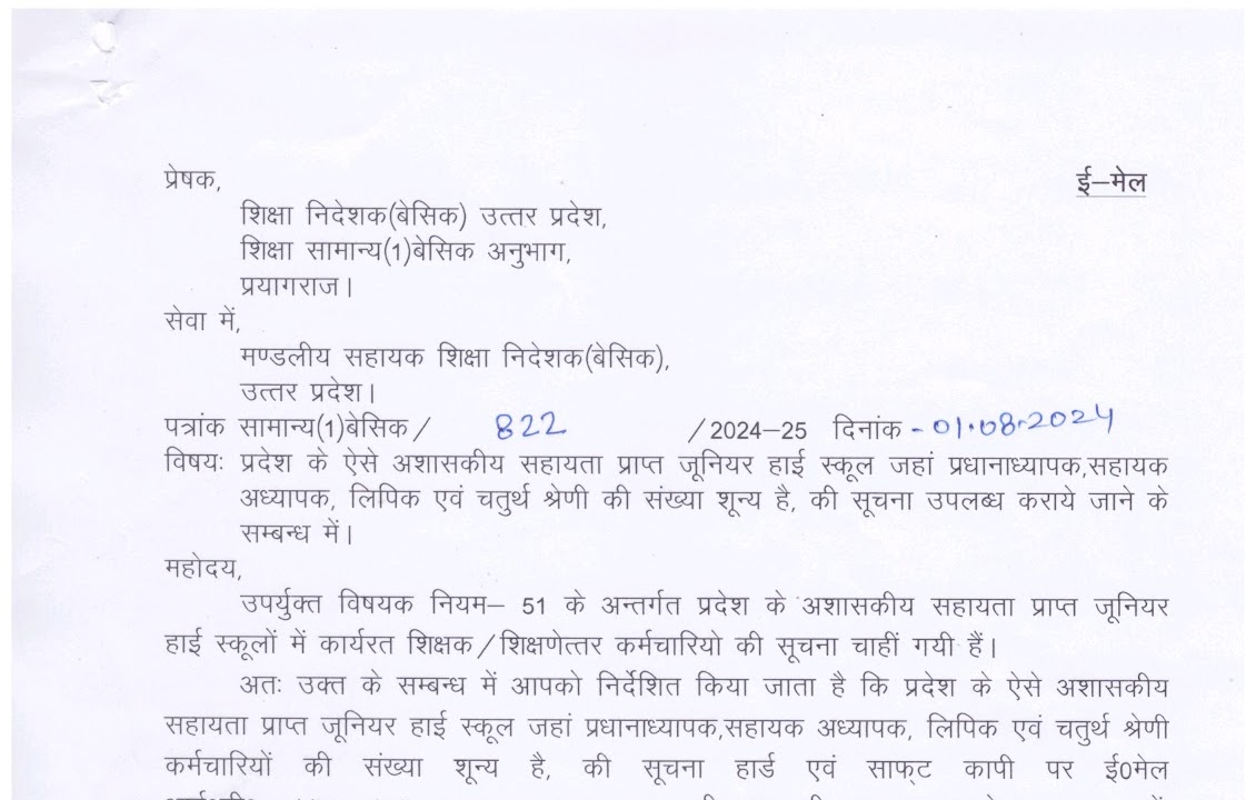 प्रदेश के ऐसे अशासकीय सहायता प्राप्त जूनियर हाई स्कूल जहां प्रधानाध्यापक, सहायक अध्यापक, लिपिक एवं चतुर्थ श्रेणी की संख्या शून्य है, की सूचना उपलब्ध कराये जाने के सम्बन्ध में।