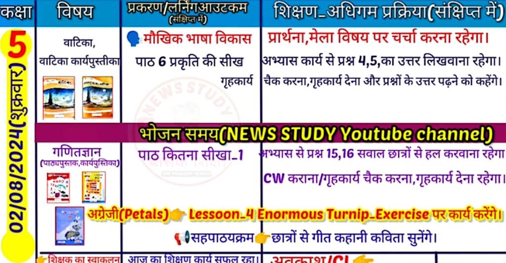 Teacher diary : दिनांक 02 अगस्त, 2024 कक्षा- 01, 02, 03, 04, 05 की भरी हुई शिक्षक , देखें Teacher ...